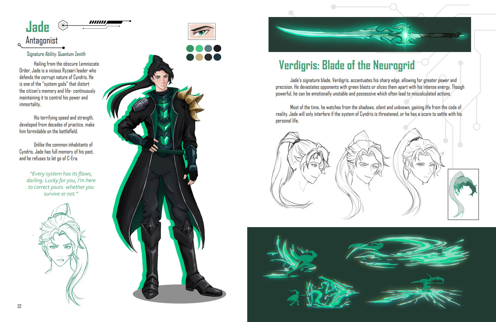 A detailed Artbook and Pitch Packet for a video game. Printed as a book.A series of drawings and writings to illustrate the fictional world of Cyndris and it’s inhabitants while showing a array of illustrative, writing, and graphic design skillsIncludes: